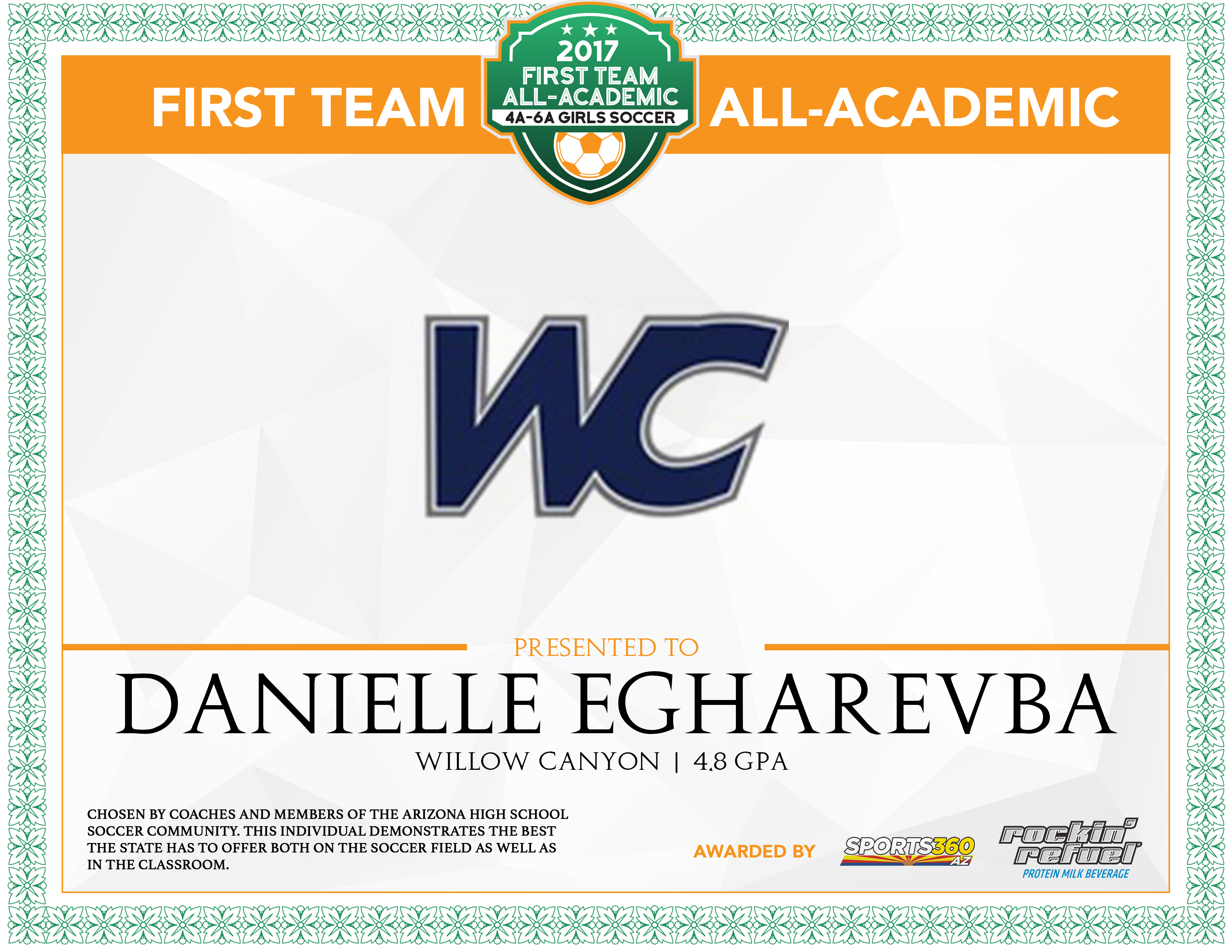 Based on the nominations from coaches and members of the Arizona High School soccer community, Sports360AZ introduces the 2016-17 Arizona All-Academic Girl’s Soccer Team for the 4A-6A Divisions presented by Rockin’ Refuel, spotlighting the best the state has to offer both on the court as well as in the classroom.