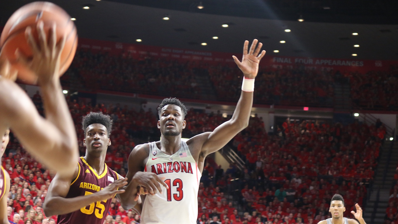Arizona State University College Featured University of Arizona GALLERY: Arizona and ASU Hoops Jordan Hamm Posted December 31, 2017 at 12:54 am Share Tweet Share Deandre Ayton 4 Image 37 of 70 Photos by Jordan Hamm Related posts: Arizona-Arizona State MBB Primer with Insider Jon Rothstein Pac-12 Tourney Storylines For Wildcats, Sun Devils Takeaways from No. 16 Arizona State’s loss at Stanford ‘Cats Clip Devils In Tempe: Five Things We Learned Share Tweet Share Alex Barcello DeQuon LakeAllonzo TrierBobby HurleyDeAndre AytonDusan RisticKodi JusticeMcKale CenterParker Jackson-CartwrightRemy MartinSean MillerShannon EvansTra Holder