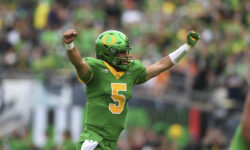 Oregon quarterback Dante Moore (5) (AP Photo/Mark Ylen)