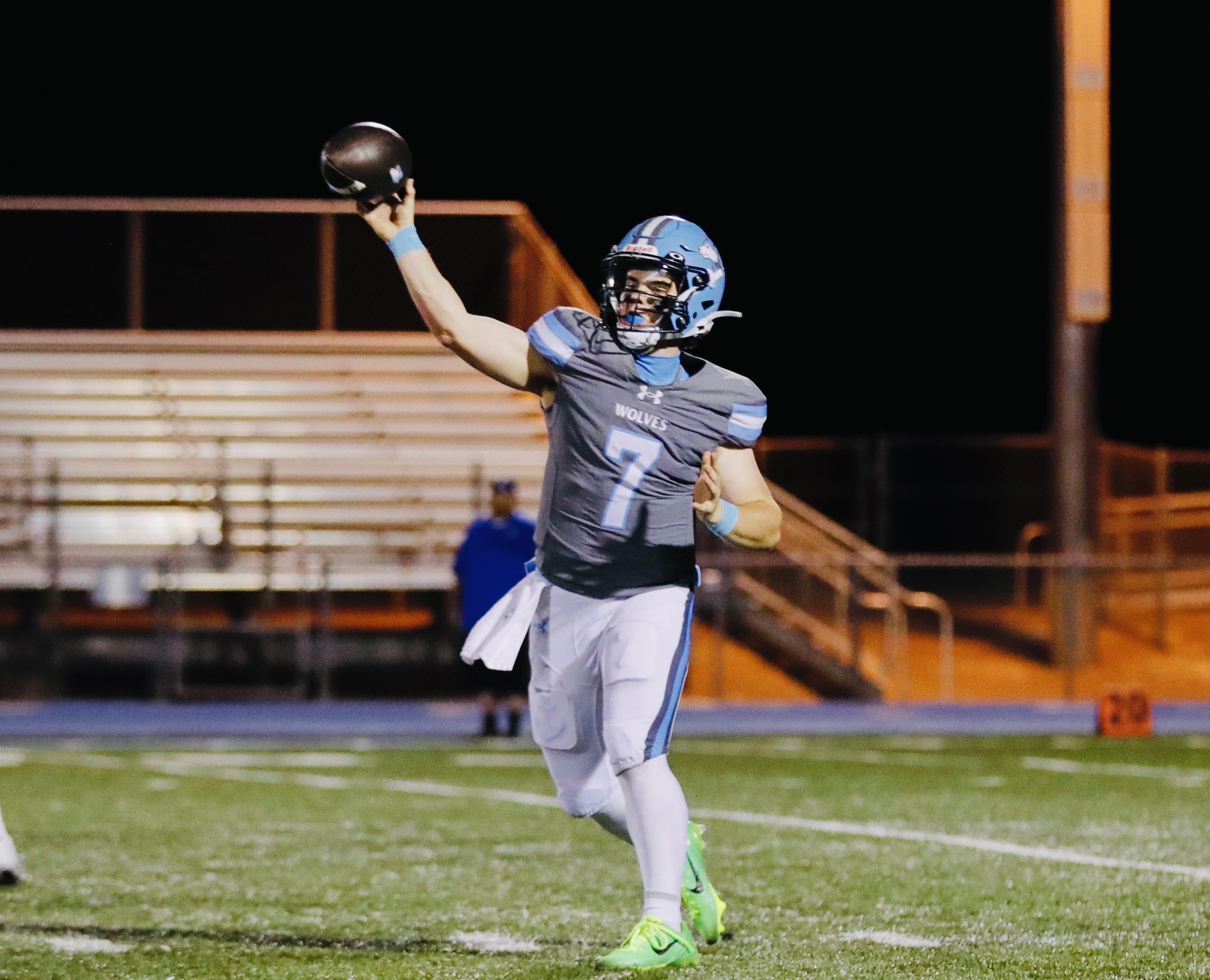 The experience was a little different in the recently-completed 2025 season.  The Wolves graduated many players off of the previous year’s team.  Only nine starters returned (three on offense).  A new defensive coordinator came in with Austyn Hull.  It was time for a a new crew to step up.  Complicating matters was a position shift for the first part of the season.  A rare transfer came in with quarterback Mickey Raftery from Canyon View.  With him having to sit the first five games due to transfer rules, the team’s top receiver manned the QB spot during the non-region portion of the schedule in August and September.